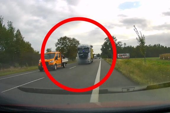 Skrajną nieodpowiedzialnością wykazał się kierujący pojazdem ciężarowym, którego zachowanie nagrała kamerka samochodowa innego kierowcy. Kierowca ciężarowego mercedesa wyprzedzał „na trzeciego”, zmuszając prawidłowo jadącego uczestnika ruchu drogowego do zjechania na pobocze. Na szczęście nie doszło do czołowego zderzenia pojazdów.
