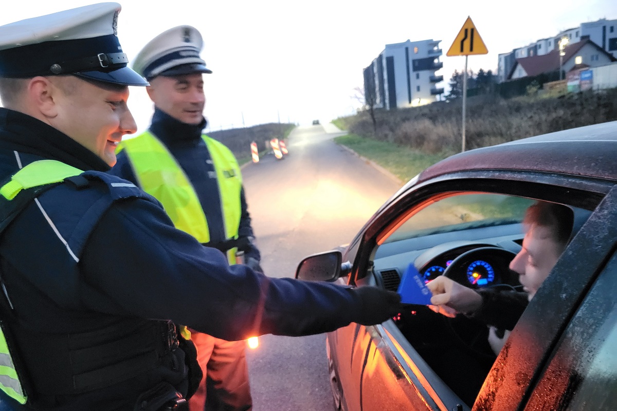 Policjanci ruchu drogowego ze Świecia wręczali kierowcom zimowe prezenty