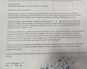 Na skrzynkę mailową komendanta policji w Chełmnie wpłynęły pisemne podziękowania od kierowcy, który brał udział w zdarzeniu drogowym w Cepnie. Z jego relacji wynikało, że gdy jechał autem, na jezdnię nagle wbiegł kot. Niestety został potrącony. W samochodzie znajdowały się dzieci, co dodatkowo potęgowało emocje związane z całą sytuacją.