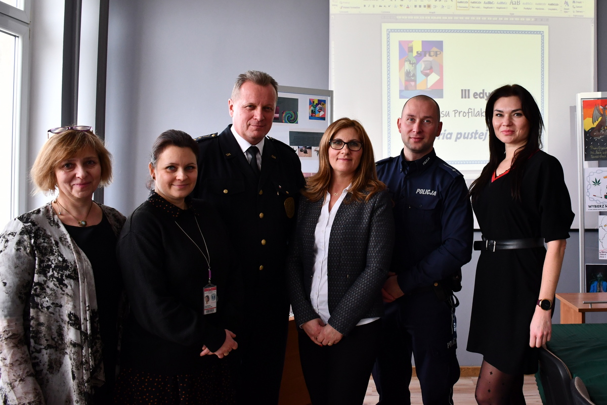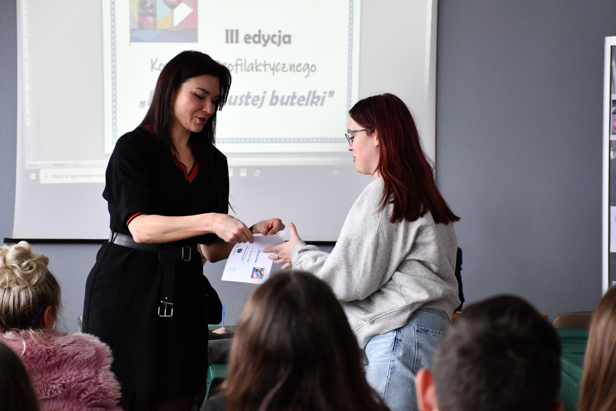 We wtorek (13.12.2022) mł. asp. Adrian Cieślewicz kierownik Ogniwa Profilaktyki Społecznej, Nieletnich i Patologii oraz policyjny profilaktyk Izabela Adamczak-Trzaskalska z Komisariatu Policji Bydgoszcz-Śródmieście odwiedzili Zespół Szkół Ekonomiczno-Administracyjnych przy ul. Gajowej 98 w Bydgoszczy. Funkcjonariusze zaproszeni zostali na uroczysty finał projektu realizowanego w ramach Miejskiego Programu Profilaktyki ,,Historia pustej butelki”- edycja III.