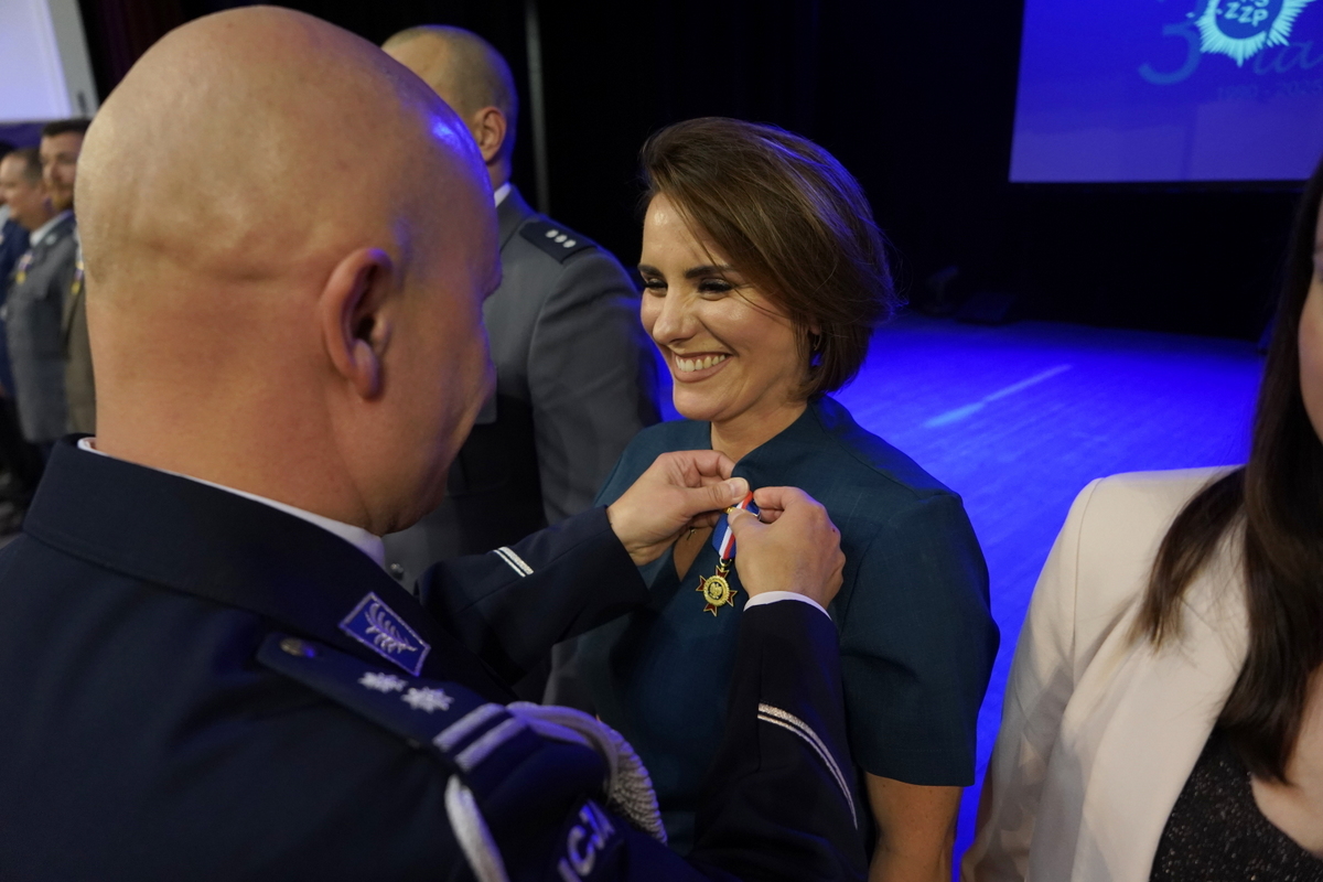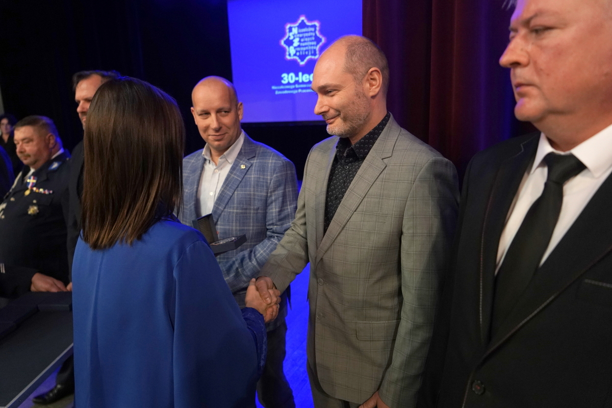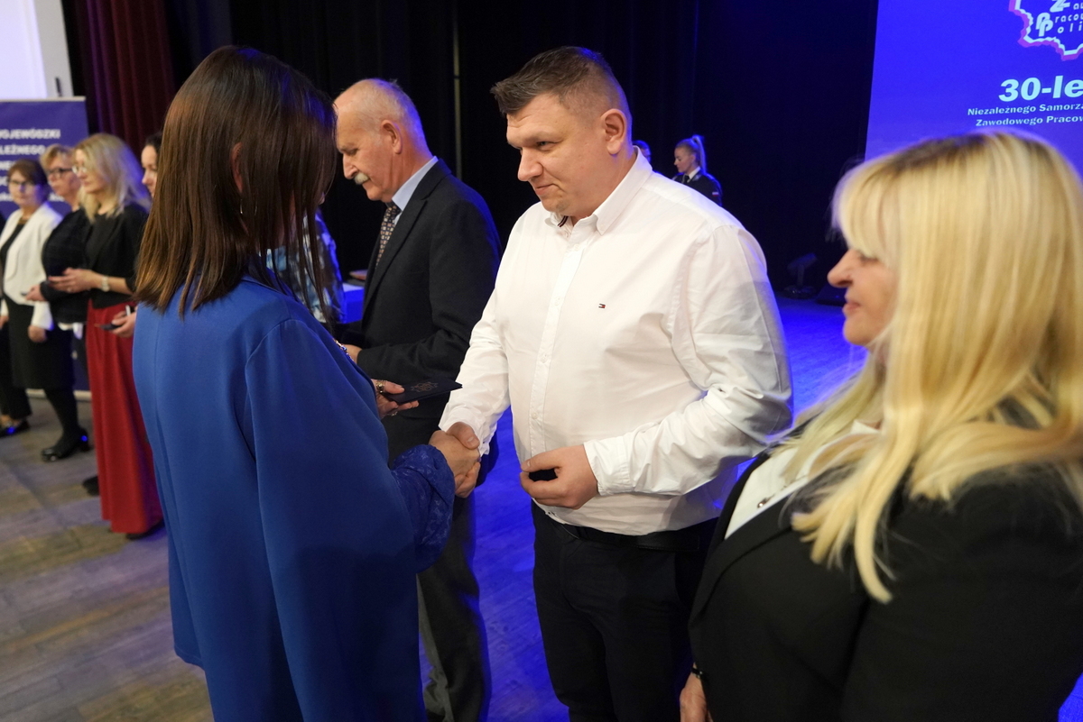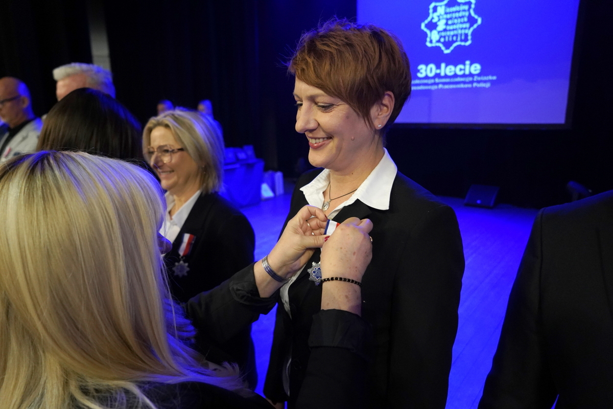 - Pani Sandra Szymaniak Przewodnicząca WZZ NSZZ Pracowników Policji w Bydgoszczy, która w swoim wystąpieniu nadmieniła, że Jubileusz jest znamienitym czasem do podsumowań, wspomnień i wdzięczności. Podziękowań dla obecnych działaczy, ale i ludzi pełnych odwagi, a także społecznej wrażliwości, którzy tworzyli struktury NSZZ PP na szczeblu krajowym i wojewódzkim m.in. Panów Michała Ćwieki, Władysława Grzegorczyka, Zbigniewa Szmigiero, Bogusława Gołuńskiego i Mariusza Jarockiego, Podkreśliła, że trzydzieści lat działalności to niezliczona ilość sytuacji, w których Związek zawsze stawał po stronie pracownika, stając się symbolem jedności, wsparcia i troski o drugiego człowieka. Dodała, że Policja to nie tylko koleżanki i koledzy w mundurach, których widać w codziennej służbie, ale także solidne zaplecze w postaci 25 tysięcznej kompetentnej, lojalnej i oddanej wartościom patriotycznym załogi pracowników Policji, których codzienna praca na „pierwszy rzut oka" jest niewidoczna, ale bez niej codzienne funkcjonowanie polskiej Policji byłoby niemożliwe. Na koniec złożyła wszystkim związkowcom podziękowania oraz życzenia dalszego rozwoju i umacniania pozycji NSZZ PP, jako partnera w dialogu społecznym.