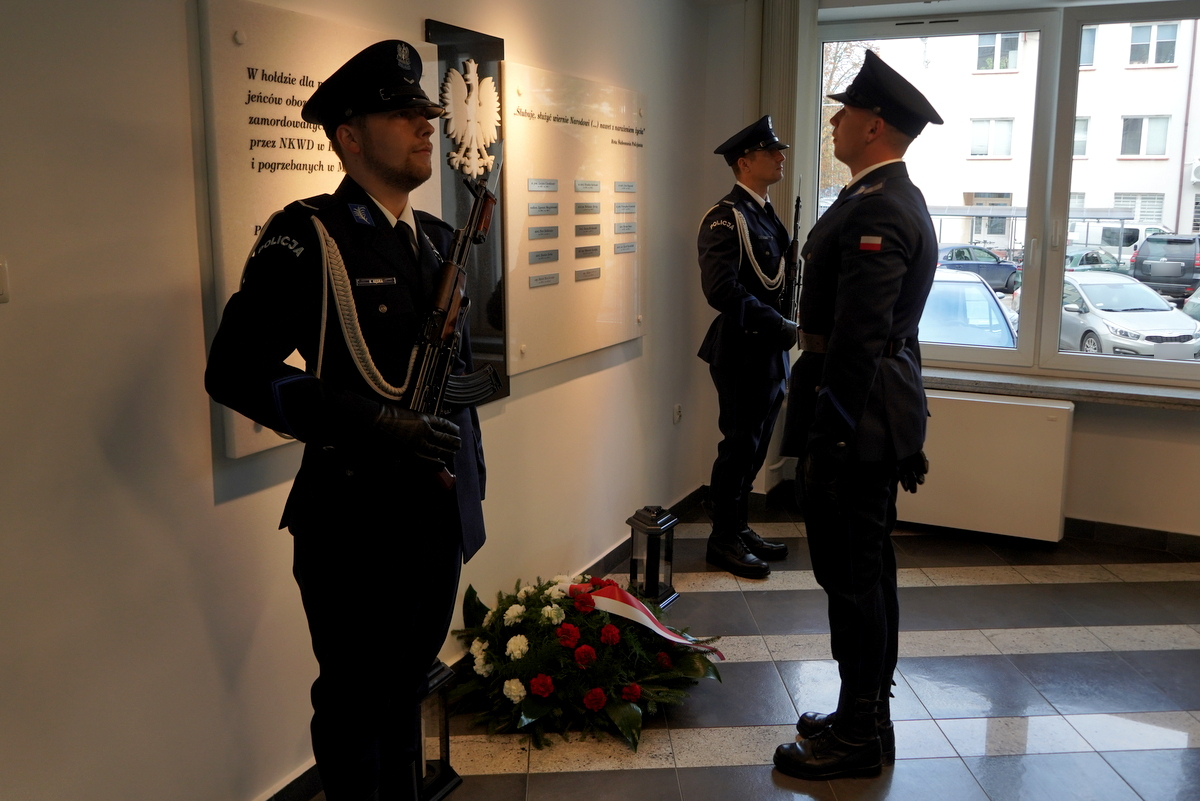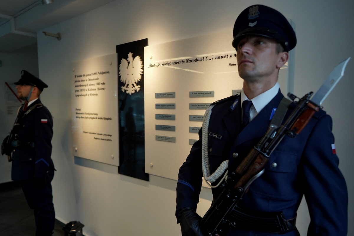 „W hołdzie dla ponad 5000 Policjantów, jeńców obozu w Ostaszkowie zamordowanych wiosną 1940 roku przez NKWD w Kalininie (Twerze) i pogrzebanych w Miednoje. Pamięci Bohaterskich Funkcjonariuszy, którzy ofiarą życia przypłacili służbę Ojczyźnie.”