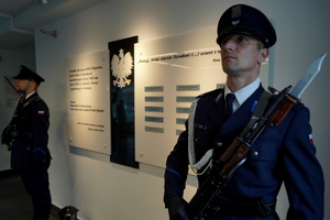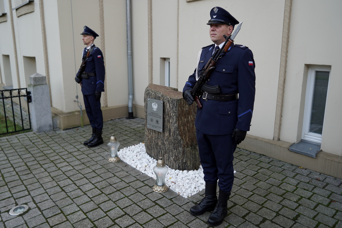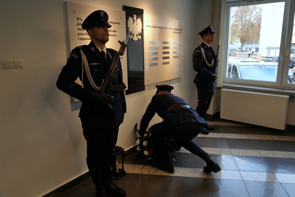 Na tablicy znajduje się kilkanaście tabliczek epitafijnych upamiętniających nazwiska policjantów, którzy zginęli na służbie. Tu złożono kolejny z wieńców, które symbolicznie dają świadectwo naszej pamięci o zmarłych.