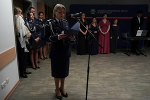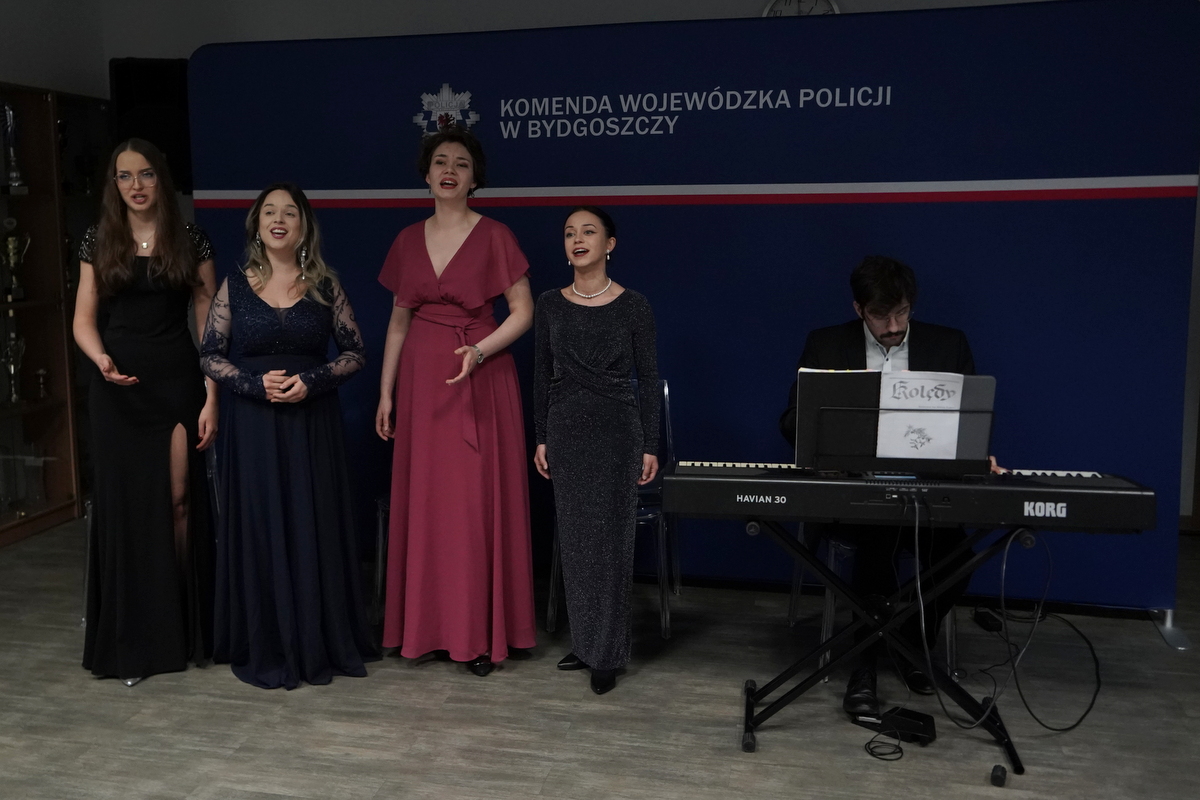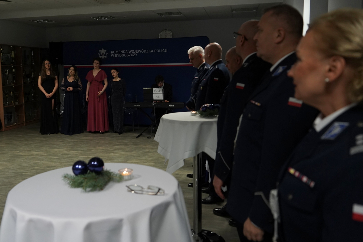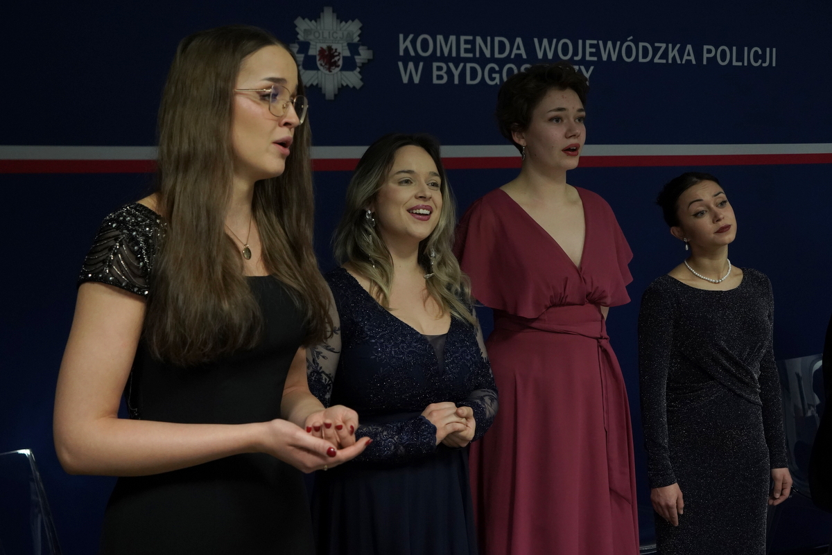 Kadra garnizonu kujawsko-pomorskiej Policji oraz zaproszeni goście licznie zgromadzili się w Komendzie Wojewódzkiej Policji w Bydgoszczy na wigilijnym spotkaniu, które rozpoczął krótki koncert kolęd w wykonaniu studentów Akademii Muzycznej imienia Feliksa Nowowiejskiego w Bydgoszczy.