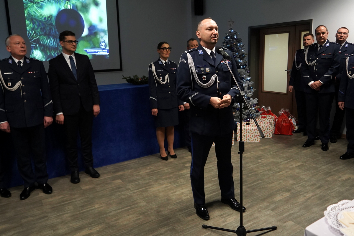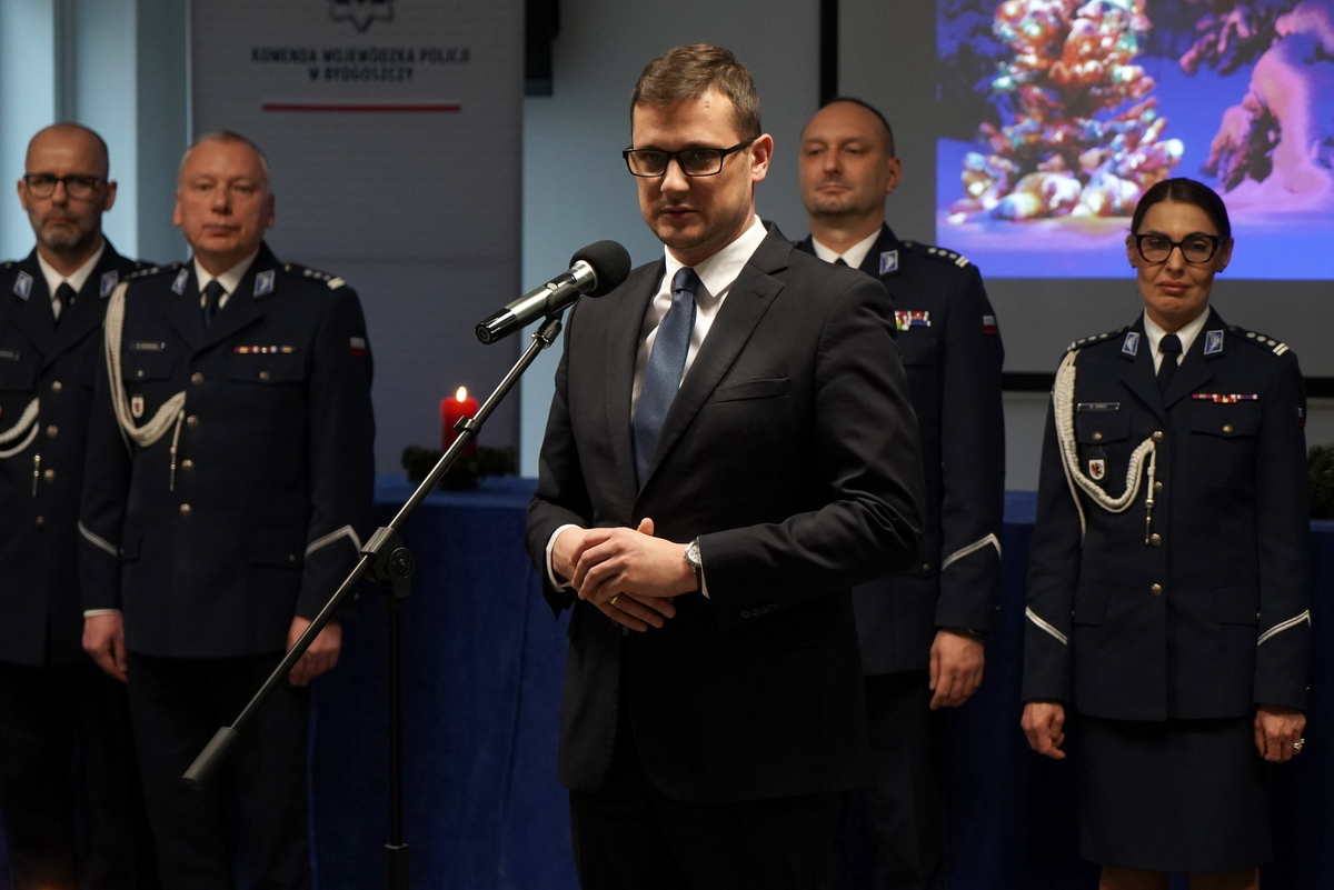 Jako pierwszy, podczas wigilijnego spotkania, głos zabrał Komendant Wojewódzki Policji w Bydgoszczy inspektor Jakub Gorczyński, który podziękował obecnym na sali za pracę w roku 2025 oraz życzył spokojnych i bezpiecznych Świąt Bożego Narodzenia.