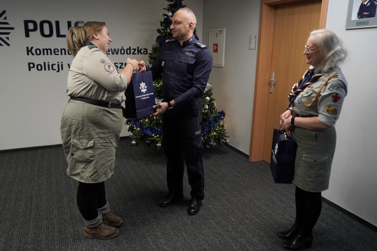 Wraz z podziękowaniem za pamięć o policjantach i pracownikach Policji, Komendant Wojewódzki Policji w Bydgoszczy insp. Jakub Gorczyński złożył harcerkom najlepsze życzenia świąteczno-noworoczne i przekazał drobne upominki.