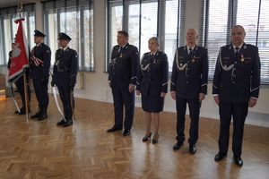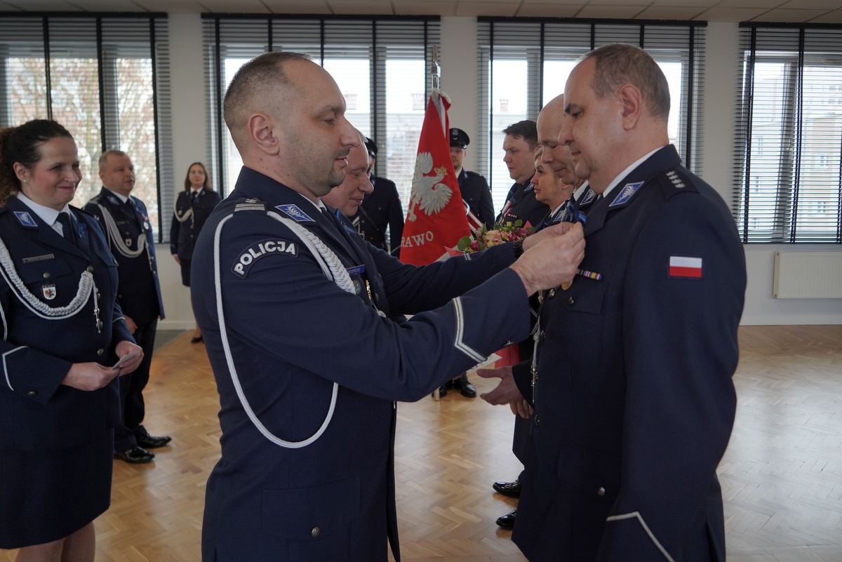 Podczas zbiórki pożegnaliśmy policjantów, odchodzących po wielu latach służby na emeryturę, którzy ostatnio zajmowali stanowiska kierownicze. Z mundurem pożegnali się: inspektor Radosław Tuszyński Komendant Powiatowy Policji w Aleksandrowie Kujawskim, młodszy inspektor Sylwia Malinowska Zastępca Komendanta Powiatowego Policji w Inowrocławiu, młodszy inspektor Tomasz Niedzielski Naczelnik Wydziału do walki z Przestępczością Gospodarczą oraz nadkomisarz Grzegorz Dunajski Zastępca Naczelnika Wydziału Łączności i Informatyki Komendy Wojewódzkiej Policji w Bydgoszczy.