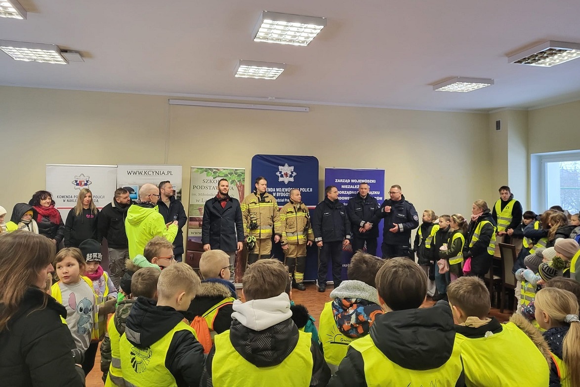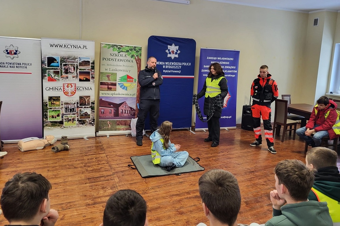 W miniony piątek (30.01.26) uczniowie Szkoły Podstawowej im. Miłośników Przyrody w Laskownicy uczestniczyli w nietypowym przedsięwzięciu, jakim była praktyczna lekcja o bezpieczeństwie podczas nadchodzących ferii. Do udziału w festynie zaproszeni zostali m.in. funkcjonariusze Komendy Wojewódzkiej Policji w Bydgoszczy, Oddziału Prewencji Policji w Bydgoszczy, Komendy Powiatowej Policji w Nakle nad Notecią oraz przedstawiciel NSZZ Policjantów woj. kujawsko-pomorskiego.