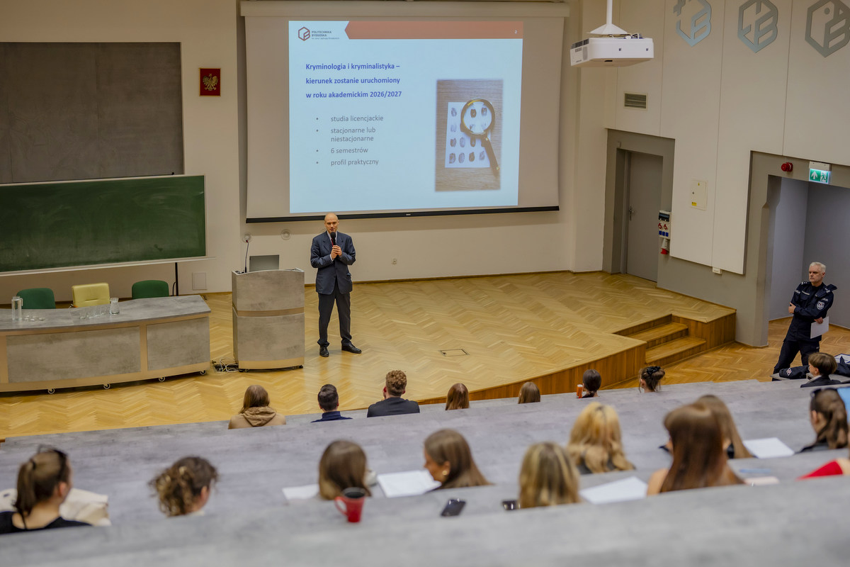 Wczoraj (11.03.2026) w Audytorium Novum Politechniki Bydgoskiej kujawsko-pomorscy policjanci spotkali się ze studentami. Wykład prowadzony przez funkcjonariuszy miało na celu przybliżenie młodym ludziom wybranych zagadnień związanych z bezpieczeństwem oraz współczesnymi zagrożeniami.