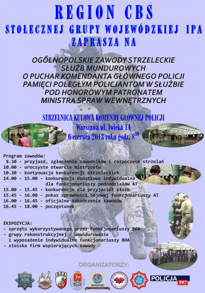 6 czerwca 2013 roku na strzelnicy kulowej Komendy Głównej Policji (Warszawa, ul. Iwicka 14) odbędą się Ogólnopolskie Zawody Strzeleckie Służb Mundurowych o Puchar Komendanta Głównego Policji Pamięci Poległym Policjantom w Służbie pod Honorowym Patronatem Ministra Spraw Wewnętrznych.