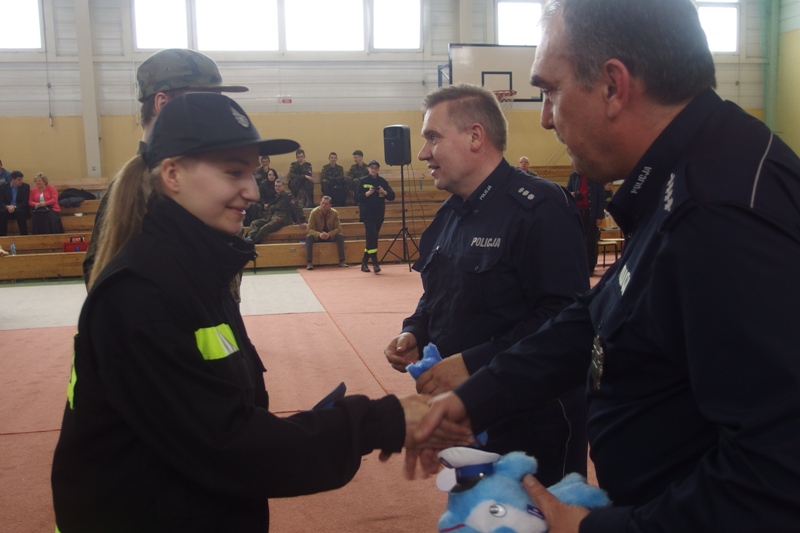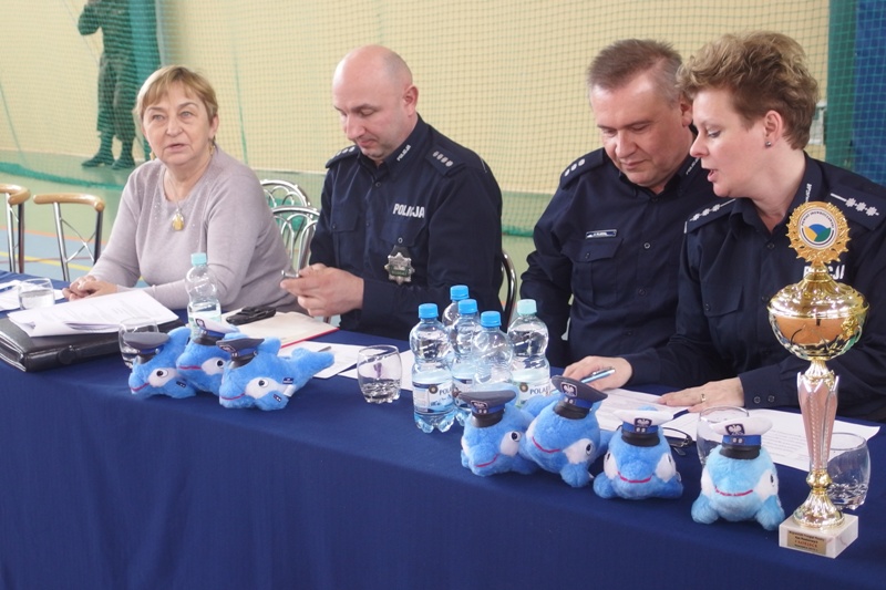 Puchary i nagrody trzem najlepszym drużynom wręczył Pan przewodniczący jury oraz Pani Wicestarosta Inowrocławski. Policjanci, dowódców drużyn uhonorowali policyjnymi maskotkami.