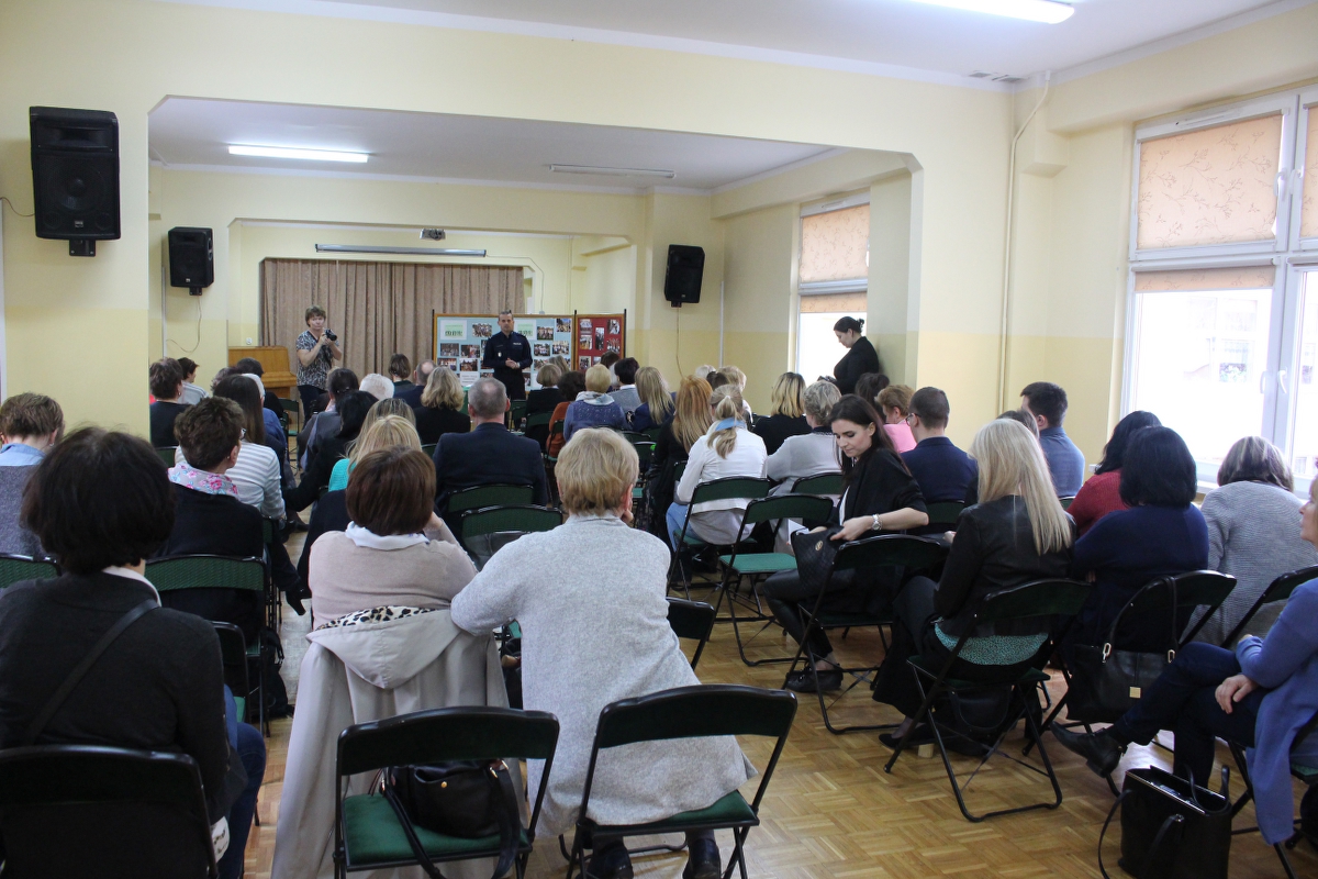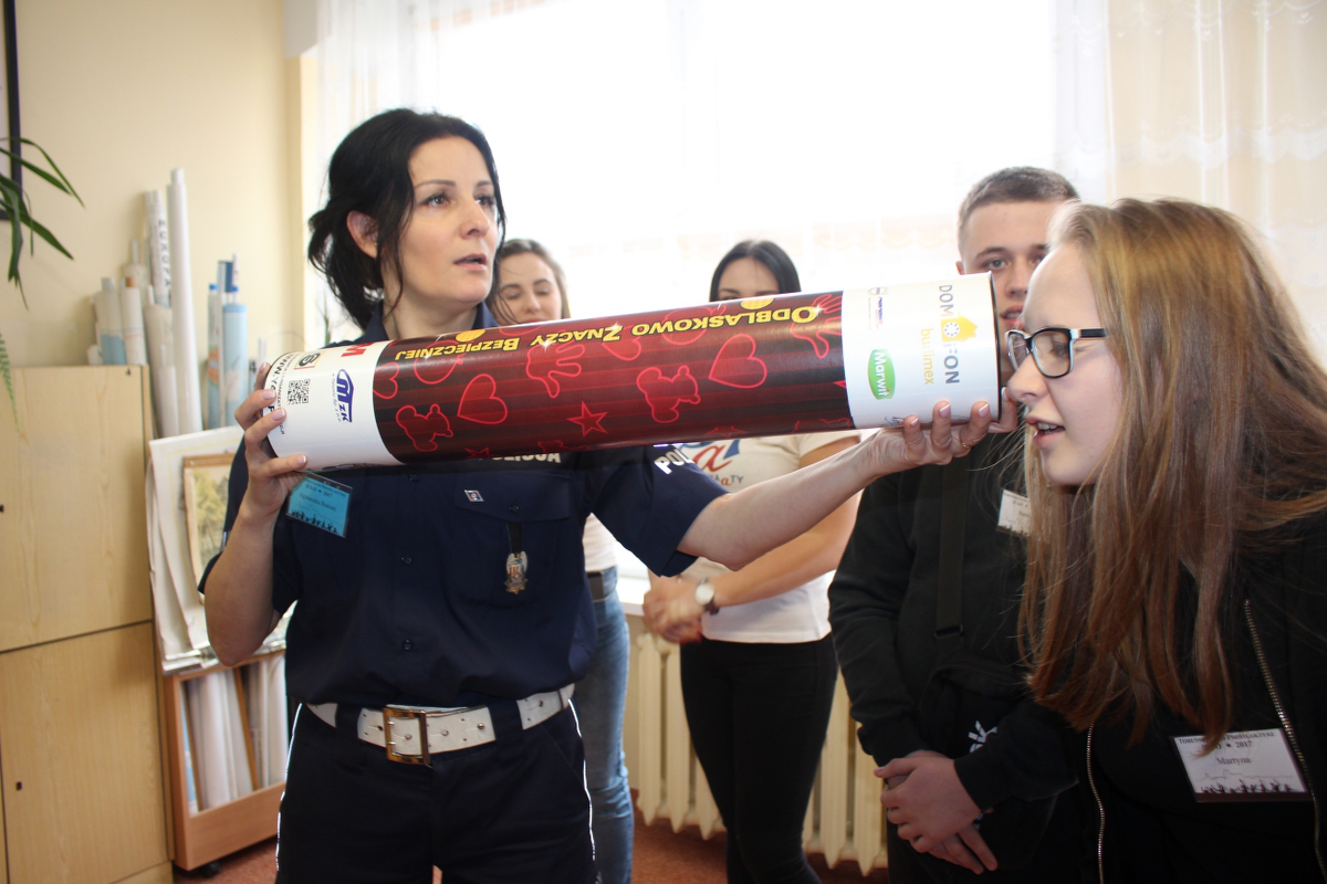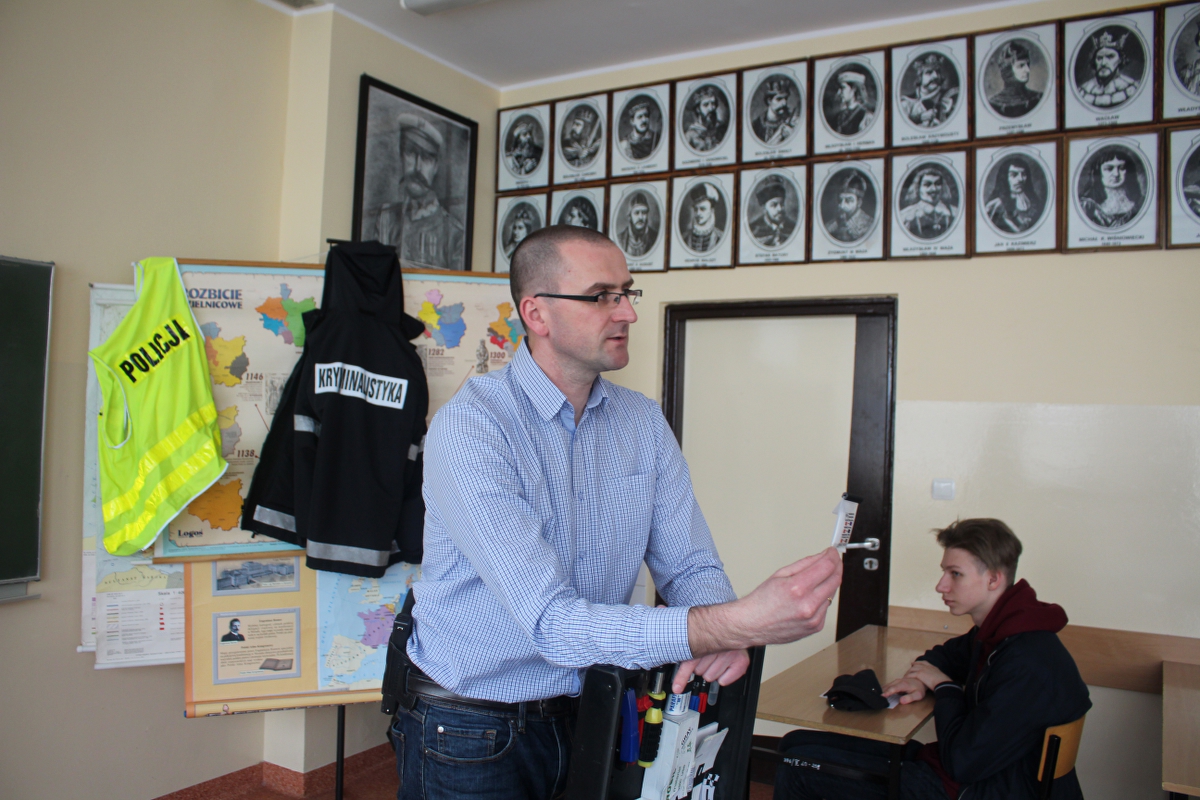 Podinsp. Krzysztof Lewandowski I Zastępca Komendanta Miejskiego Policji w Toruniu wygłosił prelekcję dla nauczycieli nt. ,,Problematyki bezpieczeństwa dzieci i młodzieży w kontekście współczesnych zagrożeń”. Natomiast funkcjonariusze KMP w Toruniu asp. Małgorzata Świątkowska-Olewińska, asp. szt. Dariusz Olewiński, sierż. szt. Łukasz Juras prowadzili warsztaty kryminalistyczne pod nazwą ,,Śladami technik kryminalistycznych” podczas, których uczniowie zapoznali się z tajnikami pracy technika kryminalistyki. Młodzież miała okazję przeprowadzić oględziny upozorowanego miejsca zdarzenia, w taki sposób, jak odbywa się to w rzeczywistości . Ujawniali i zabezpieczali ślady kryminalistyczne, a także wykonywali niezbędną dokumentację procesową. Funkcjonariuszka z Wydziału Ruchu Drogowego st. sierż. Agnieszka Bubień prowadziła warsztaty pod nazwą ,,Bezpieczny pieszy”, na których młodzież przy wykorzystaniu tzw. ,,Magicznej tuby” pokazała, jak ważne jest noszenie po zmroku elementów odblaskowych. Uczestnicy warsztatów za pomocą alkogogli i narkogogli mogli przekonać się, jak widzi osoba będąca pod wpływem alkoholu czy narkotyków. Problemem okazało się prawidłowe przejście kilku kroków. Dzięki temu uczniowie mogli sobie wyobrazić, jak niebezpieczne i nieodpowiedzialne jest wsiadanie ,,pod wpływem” za kierownicę. Warsztaty cieszyły się ogromnym zainteresowaniem podczas, których młodzież brała aktywny udział zadając wiele merytorycznych pytań.