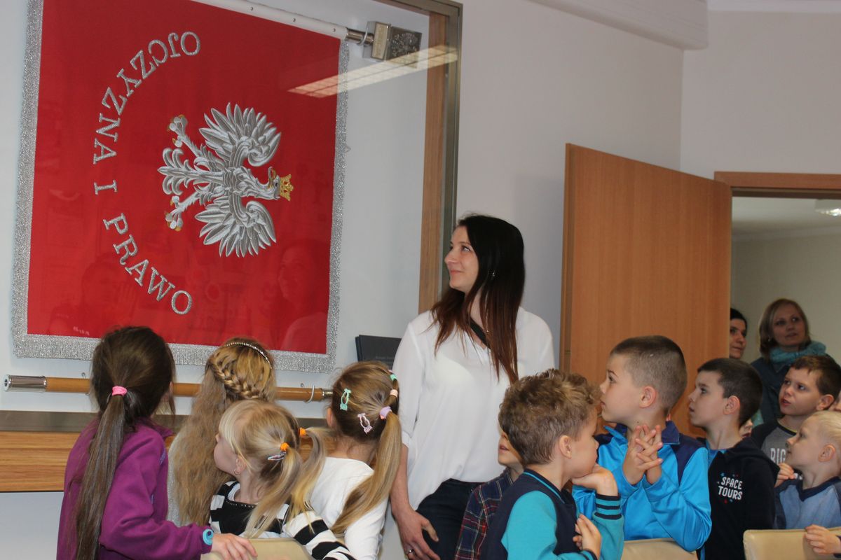 Podczas oglądania sekretariatu i biur udało się spotkać komendanta i zajrzeć także do jego gabinetu. Na sali odpraw dzieci podziwiały sztandar jednostki. Tam też, swoją galerię mają prace plastyczne innych, którzy także odwiedzali policjantów i w ramach podziękowania przynieśli im swoje rysunki. Galeria powiększy się o nowy piękny radiowóz, który namalowały dzieci z Wielgiego.