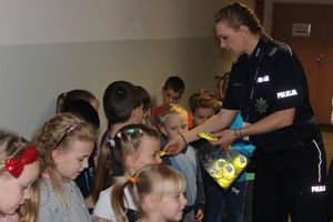 Na koniec wizyty, policjanci przypomnieli dzieciom zasady poruszania się po drodze i rozdali zawieszki odblaskowe.