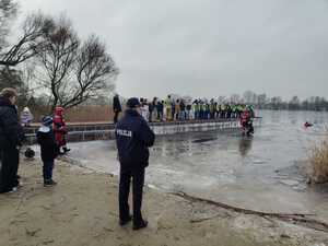 Policjantka prewencji wzięła udział w przygotowanym przez mogileńskich strażaków pokazie ratownictwa na lodzie. Wszystko po to, żeby uświadomić najmłodszym, jak może się skończyć nieostrożne wchodzenie na zamarznięte jezioro i rzekę.